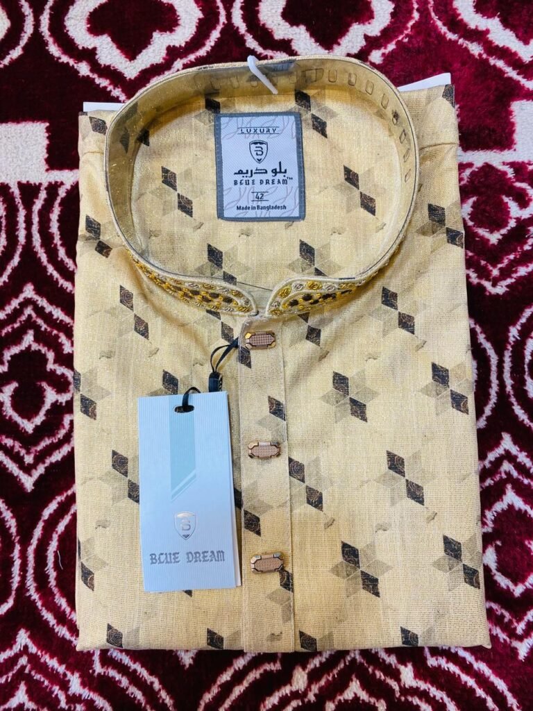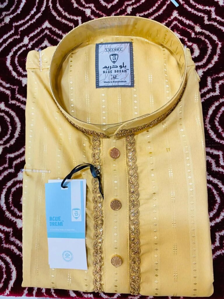The fabric is soft, breathable, and light, making it ideal for all-day wear, especially during the warmer months. The intricate striped pattern is subtle yet bold, making a statement while maintaining a traditional charm. Featuring a Mandarin collar and sleek button closures, this panjabi embodies sophistication and style, making it a must-have for anyone looking to make a refined statement.
